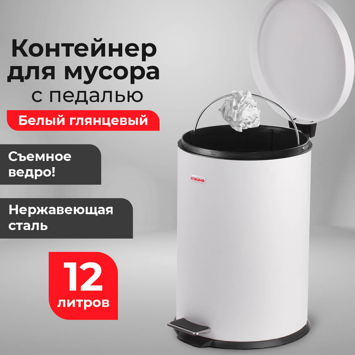 Ведро-контейнер для мусора (урна) с педалью LAIMA Classic, 12 л, белое, глянцевое, металл, со съемным внутренним ведром